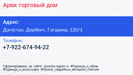 Арви, торговый дом по адресу Дагестан, Дербент, Гагарина, 120/1 в дальнейшем Организация, размещена в следующих категориях: