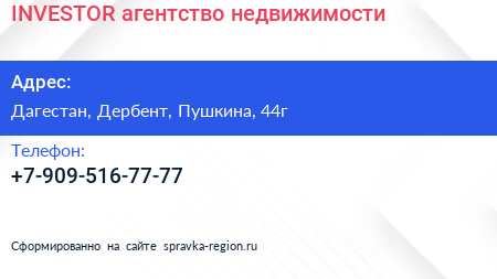 INVESTOR, агентство недвижимости по адресу Дагестан, Дербент, Пушкина, 44г в дальнейшем Организация, размещена в следующих категориях: