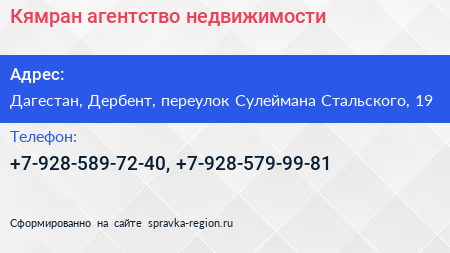 Кямран, агентство недвижимости по адресу Дагестан, Дербент, переулок Сулеймана Стальского, 19 в дальнейшем Организация, размещена в следующих категориях: