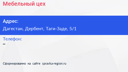 Мебельный цех по адресу Дагестан, Дербент, Таги-Заде, 5/1 в дальнейшем Организация, размещена в следующих категориях: