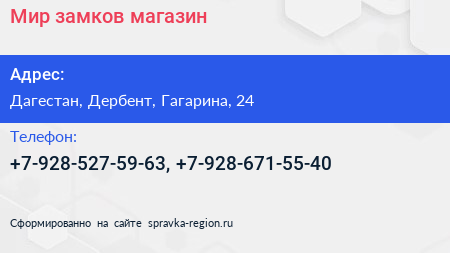 Мир замков, магазин по адресу Дагестан, Дербент, Гагарина, 24 в дальнейшем Организация, размещена в следующих категориях: