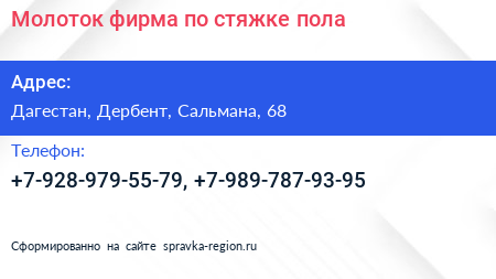 Молоток, фирма по стяжке пола по адресу Дагестан, Дербент, Сальмана, 68 в дальнейшем Организация, размещена в следующих категориях: