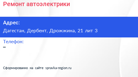Ремонт автоэлектрики по адресу Дагестан, Дербент, Дрожжина, 21 лит 3 в дальнейшем Организация, размещена в следующих категориях: