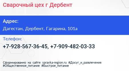 Сварочный цех, г. Дербент по адресу Дагестан, Дербент, Гагарина, 101а в дальнейшем Организация, размещена в следующих категориях: