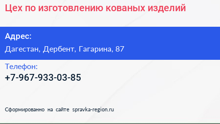 Цех по изготовлению кованых изделий по адресу Дагестан, Дербент, Гагарина, 87 в дальнейшем Организация, размещена в следующих категориях: