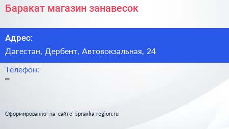 Баракат, магазин занавесок по адресу Дагестан, Дербент, Автовокзальная, 24 в дальнейшем Организация, размещена в следующих категориях: