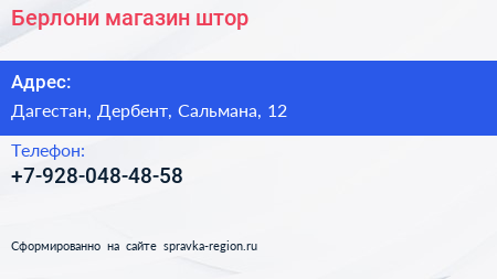 Берлони, магазин штор по адресу Дагестан, Дербент, Сальмана, 12 в дальнейшем Организация, размещена в следующих категориях: