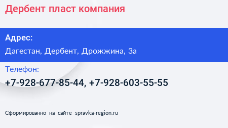 Дербент-пласт, компания по адресу Дагестан, Дербент, Дрожжина, 3а в дальнейшем Организация, размещена в следующих категориях: