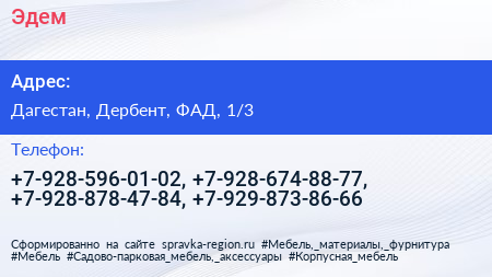 Эдем по адресу Дагестан, Дербент, ФАД, 1/3 в дальнейшем Организация, размещена в следующих категориях: