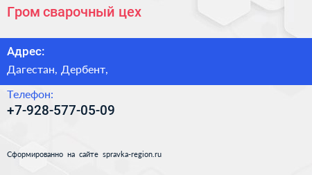 Гром, сварочный цех по адресу Дагестан, Дербент, в дальнейшем Организация, размещена в следующих категориях: