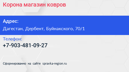 Корона, магазин ковров по адресу Дагестан, Дербент, Буйнакского, 70/1 в дальнейшем Организация, размещена в следующих категориях: