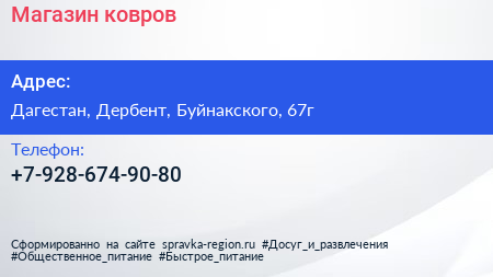 Магазин ковров по адресу Дагестан, Дербент, Буйнакского, 67г в дальнейшем Организация, размещена в следующих категориях: