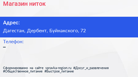 Магазин ниток по адресу Дагестан, Дербент, Буйнакского, 72 в дальнейшем Организация, размещена в следующих категориях: