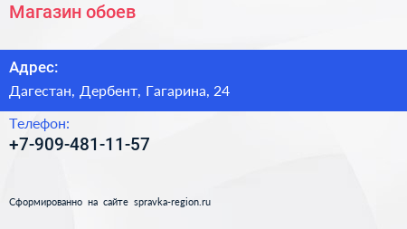 Магазин обоев по адресу Дагестан, Дербент, Гагарина, 24 в дальнейшем Организация, размещена в следующих категориях: