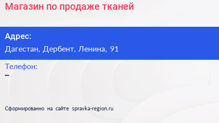 Магазин по продаже тканей по адресу Дагестан, Дербент, Ленина, 91 в дальнейшем Организация, размещена в следующих категориях: