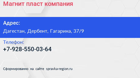 Магнит пласт, компания по адресу Дагестан, Дербент, Гагарина, 37/9 в дальнейшем Организация, размещена в следующих категориях: