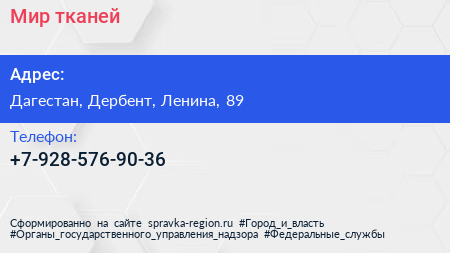 Мир тканей по адресу Дагестан, Дербент, Ленина, 89 в дальнейшем Организация, размещена в следующих категориях: