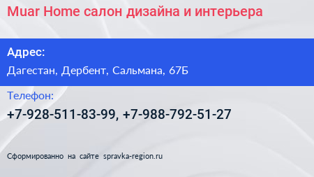 Muar Home, салон дизайна и интерьера по адресу Дагестан, Дербент, Сальмана, 67Б в дальнейшем Организация, размещена в следующих категориях: