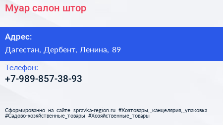 Муар, салон штор по адресу Дагестан, Дербент, Ленина, 89 в дальнейшем Организация, размещена в следующих категориях: