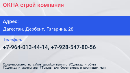 ОКНА строй, компания по адресу Дагестан, Дербент, Гагарина, 28 в дальнейшем Организация, размещена в следующих категориях: