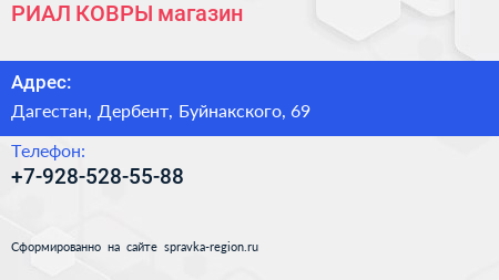 РИАЛ КОВРЫ, магазин по адресу Дагестан, Дербент, Буйнакского, 69 в дальнейшем Организация, размещена в следующих категориях: