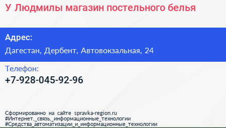 У Людмилы, магазин постельного белья по адресу Дагестан, Дербент, Автовокзальная, 24 в дальнейшем Организация, размещена в следующих категориях: