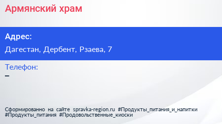 Армянский храм по адресу Дагестан, Дербент, Рзаева, 7 в дальнейшем Организация, размещена в следующих категориях: