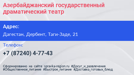 Азербайджанский государственный драматический театр по адресу Дагестан, Дербент, Таги-Заде, 21 в дальнейшем Организация, размещена в следующих категориях: