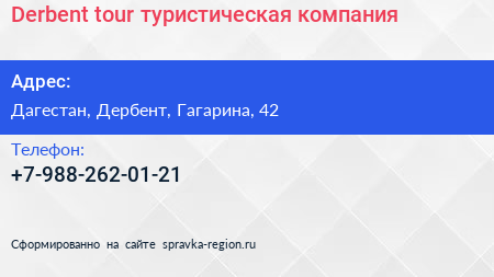 Derbent tour, туристическая компания по адресу Дагестан, Дербент, Гагарина, 42 в дальнейшем Организация, размещена в следующих категориях: