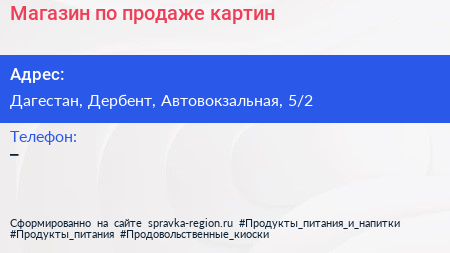 Магазин по продаже картин по адресу Дагестан, Дербент, Автовокзальная, 5/2 в дальнейшем Организация, размещена в следующих категориях: