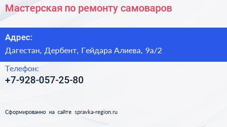 Мастерская по ремонту самоваров по адресу Дагестан, Дербент, Гейдара Алиева, 9а/2 в дальнейшем Организация, размещена в следующих категориях: