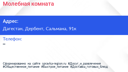 Молебная комната по адресу Дагестан, Дербент, Сальмана, 91к в дальнейшем Организация, размещена в следующих категориях: