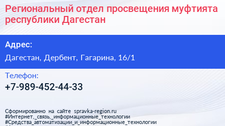 Региональный отдел просвещения муфтията республики Дагестан по адресу Дагестан, Дербент, Гагарина, 16/1 в дальнейшем Организация, размещена в следующих категориях: