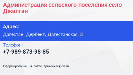 Администрация сельского поселения село Джалган по адресу Дагестан, Дербент, Дагестанская, 3 в дальнейшем Организация, размещена в следующих категориях: