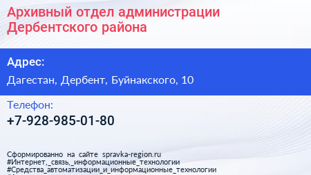Архивный отдел администрации Дербентского района по адресу Дагестан, Дербент, Буйнакского, 10 в дальнейшем Организация, размещена в следующих категориях: