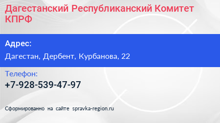 Дагестанский Республиканский Комитет КПРФ по адресу Дагестан, Дербент, Курбанова, 22 в дальнейшем Организация, размещена в следующих категориях: