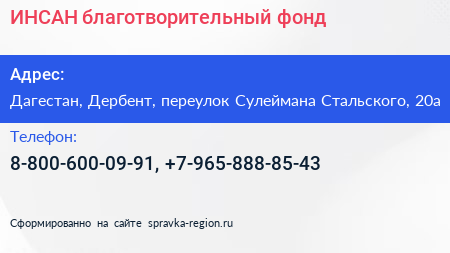 ИНСАН, благотворительный фонд по адресу Дагестан, Дербент, переулок Сулеймана Стальского, 20а в дальнейшем Организация, размещена в следующих категориях: