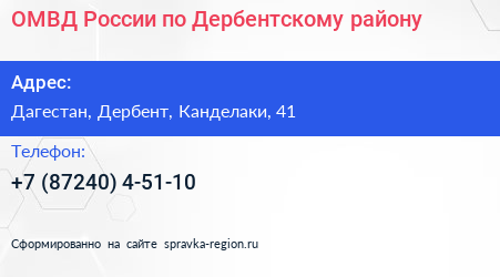ОМВД России по Дербентскому району по адресу Дагестан, Дербент, Канделаки, 41 в дальнейшем Организация, размещена в следующих категориях: