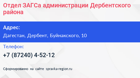 Отдел ЗАГСа администрации Дербентского района по адресу Дагестан, Дербент, Буйнакского, 10 в дальнейшем Организация, размещена в следующих категориях: