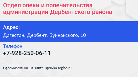 Отдел опеки и попечительства администрации Дербентского района по адресу Дагестан, Дербент, Буйнакского, 10 в дальнейшем Организация, размещена в следующих категориях: