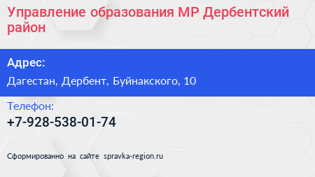Управление образования МР Дербентский район по адресу Дагестан, Дербент, Буйнакского, 10 в дальнейшем Организация, размещена в следующих категориях: