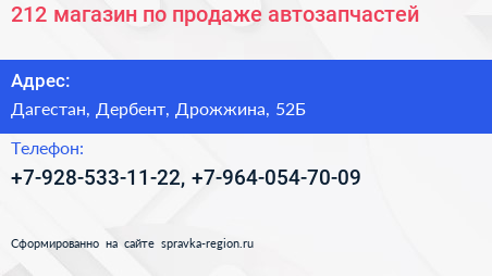 212, магазин по продаже автозапчастей по адресу Дагестан, Дербент, Дрожжина, 52Б в дальнейшем Организация, размещена в следующих категориях: