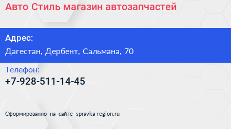 Авто Стиль, магазин автозапчастей по адресу Дагестан, Дербент, Сальмана, 70 в дальнейшем Организация, размещена в следующих категориях: