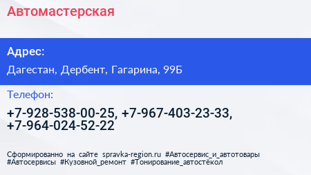 Автомастерская по адресу Дагестан, Дербент, Гагарина, 99Б в дальнейшем Организация, размещена в следующих категориях: