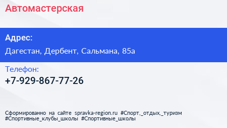 Автомастерская по адресу Дагестан, Дербент, Сальмана, 85а в дальнейшем Организация, размещена в следующих категориях: