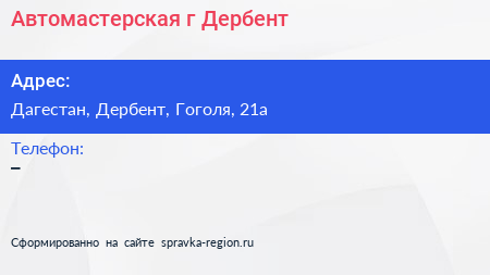 Автомастерская, г. Дербент по адресу Дагестан, Дербент, Гоголя, 21а в дальнейшем Организация, размещена в следующих категориях: