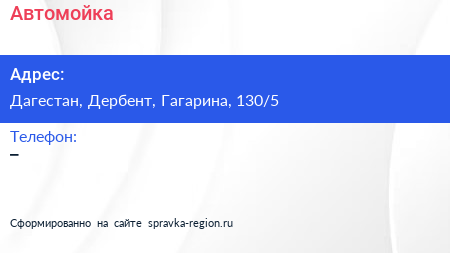 Автомойка по адресу Дагестан, Дербент, Гагарина, 130/5 в дальнейшем Организация, размещена в следующих категориях: