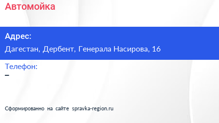 Автомойка по адресу Дагестан, Дербент, Генерала Насирова, 16 в дальнейшем Организация, размещена в следующих категориях: