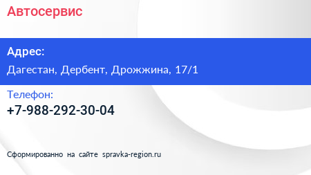 Автосервис по адресу Дагестан, Дербент, Дрожжина, 17/1 в дальнейшем Организация, размещена в следующих категориях: