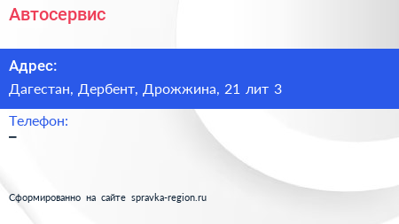 Автосервис по адресу Дагестан, Дербент, Дрожжина, 21 лит 3 в дальнейшем Организация, размещена в следующих категориях: